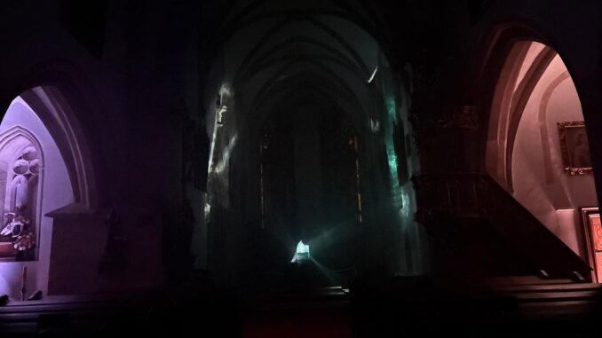 /Inspirováno instalací Glasstides od Vanessy Hafenbrädl v kostele Nanebevzetí Panny Marie, Františkánská ulice, Plzeň. Festival světla a umění ve veřejném prostoru BLIK BLIK 2026./